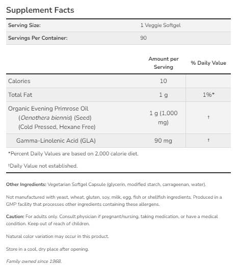Ulje noćurka izvor je linolne i gama-linolenske kiseline koje su važne za održavanje optimalnog zdravlja. Osobito je koristan za žene jer može pomoći u ublažavanju nelagodesant simptomi predmenstrualnog sindroma (PMS) i menopauze. Osim toga, ova formula je veganska i pruža sve dobrobiti bez životinjskih proizvoda.