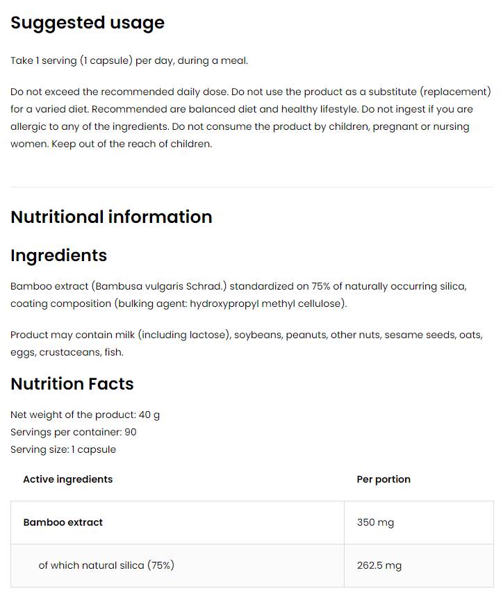 Silicij Bambus je moćan izvor silicijevog dioksida koji je neophodan za zdravlje tijela. Silicij ima važnu ulogu u održavanju zdravih kostiju, zglobova i vezivnog tkiva. Ne samo da podržava rast kose i noktiju, već ima i ključnu ulogu u proizvodnji kolagena koji je odgovoran za elastičnost i čvrstoću kože.