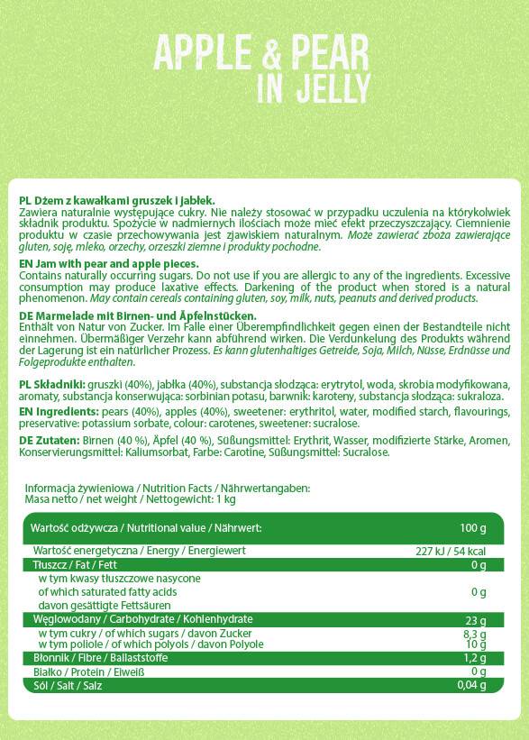 Žele s okusom jabuke i kruške vodeći je proizvod robne marke broj jedan za tekuće dodatke prehrani. Ovaj jedinstveni proizvod nudi brojne zdravstvene prednosti. Sadržani prirodni sastojci pomažu poboljšanju probave zahvaljujući visokom udjelu vlakana. Vlakna ne samo da podržavaju crijevnu peristaltiku, već pomažu i u stvaranju osjećaja sitosti.
