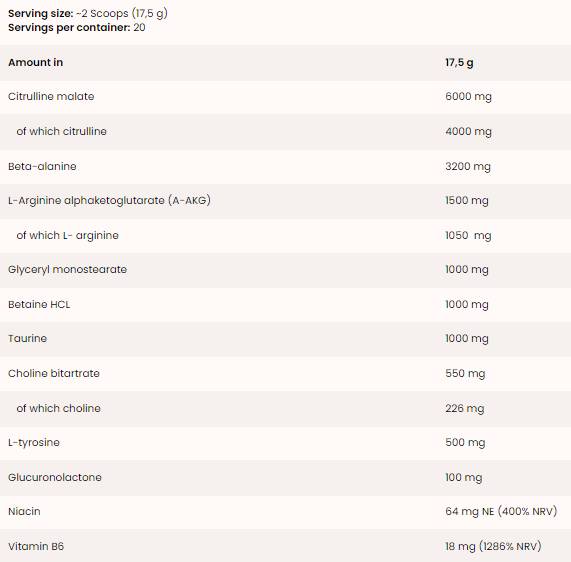 The 6000 mg citrulin malata sadržaj može pomoći u poboljšanju fizičkih performansi i ubrzanju oporavka. 3200 mg beta-alanina Poznato je da usporava nakupljanje mliječne kiseline, smanjuje umor i povećava performanse tijekom intenzivnih treninga. 1500 mg L-arginina (A-AKG) je snažan pojačivač koji povećava cirkulaciju krvi i dostavlja kisik mišićima.