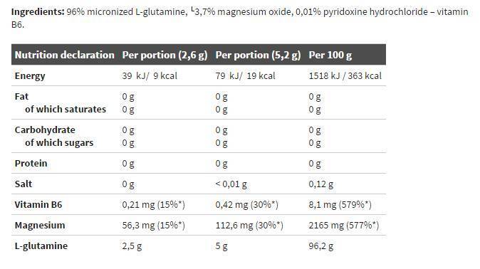 Sastojci: 96% mikronizirani L-glutamin, 3,7% magnezijev oksid, 0,01% piridoksin hidroklorid - vitamin B6.