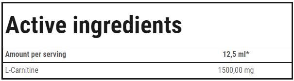 SASTOJCI: voda; L-karnitin (12%); regulator kiselosti - limunska kiselina; arome; konzervansi - kalijev sorbat, natrijev benzoat; sladila - natrijev ciklamat, acesulfam K, sukraloza, natrijev saharinat; bojilo - karmin.