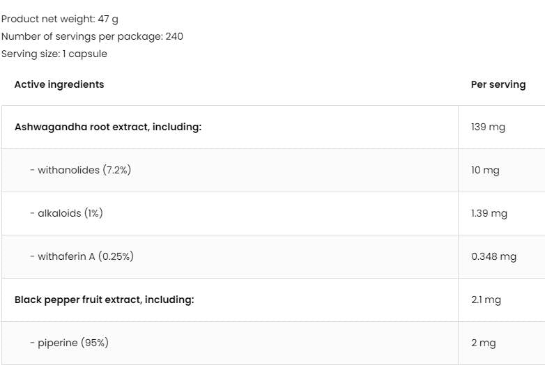 Ashwagandha ekstrakt korijena 139 mg 240 kapsula