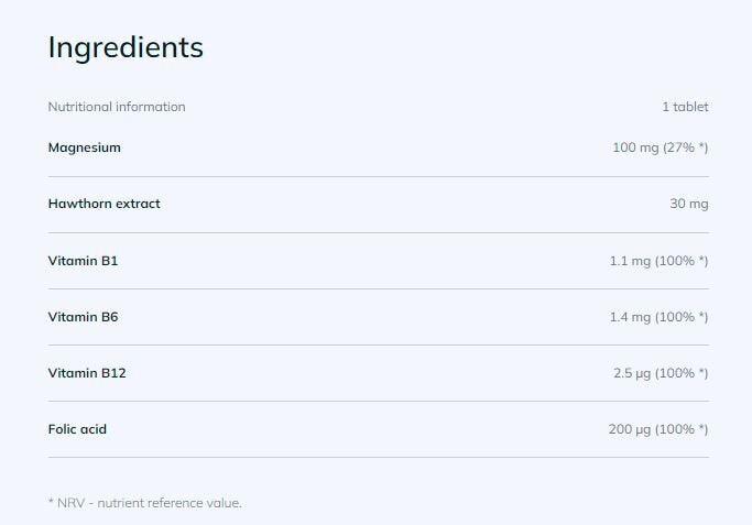Sastojci: Magnezij, glog, vitamin B1, vitamin B6, vitamin B12, folna kiselina