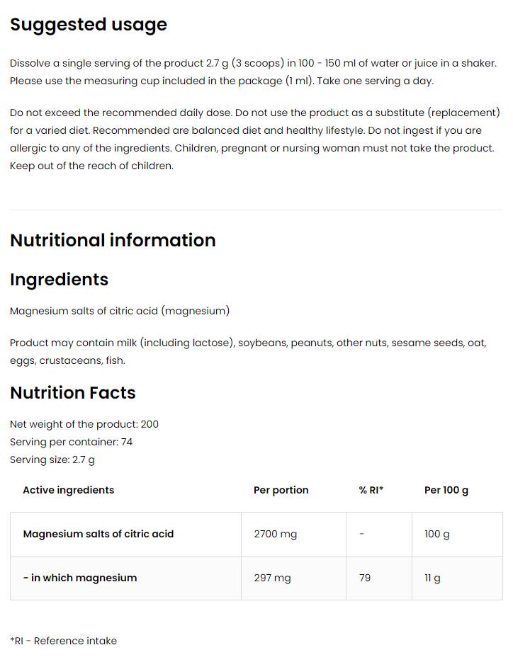 Upozorenja: Ne preporučuje se osobama s bolestima bubrega ili hipermagnezemijom. Prije upotrebe posavjetujte se s liječnikom ako imate ozbiljno zdravstveno stanje ili uzimate lijekove.