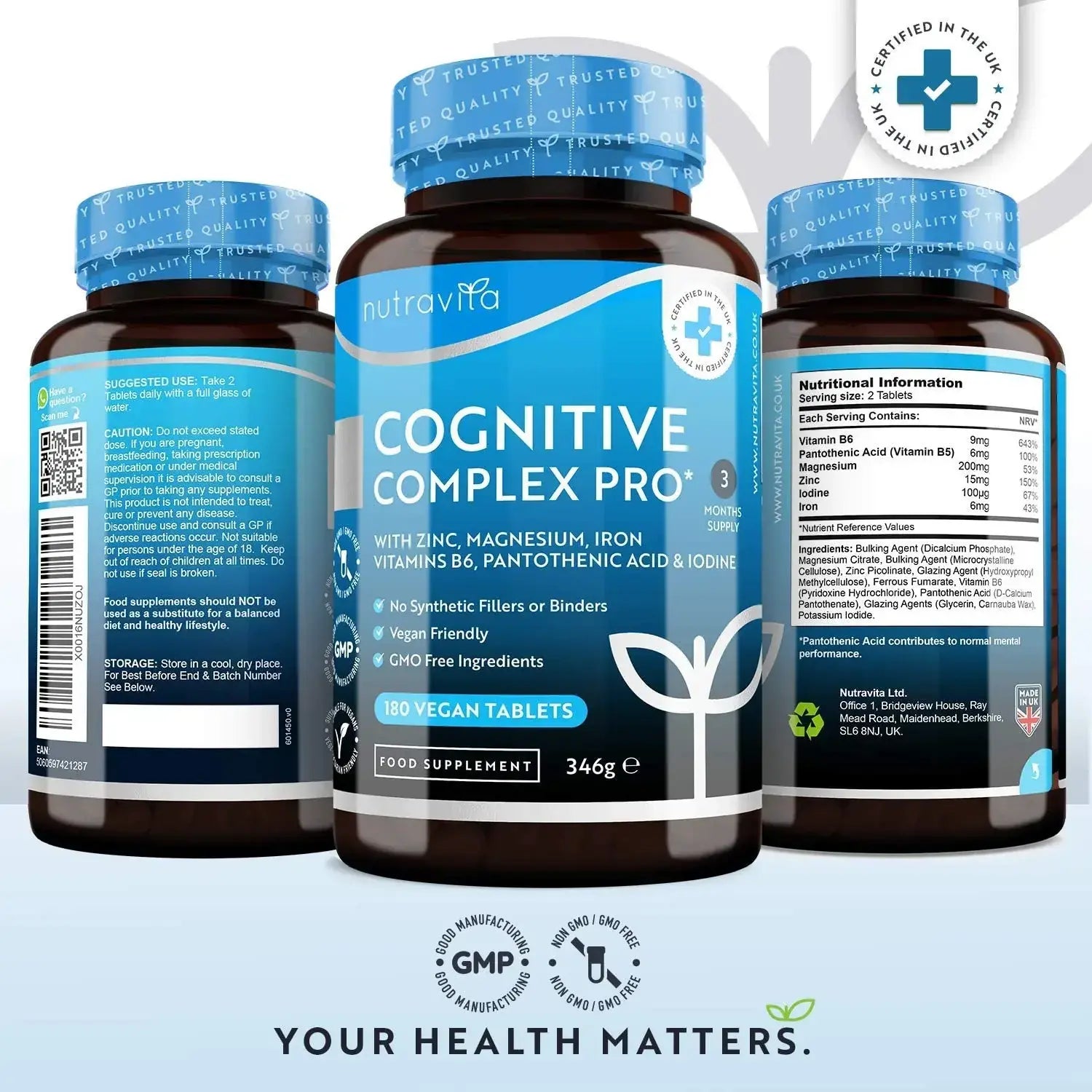 Cognitive Complex Pro posebno je formuliran za podršku kognitivnom zdravlju kroz jedinstvenu kombinaciju esencijalnih hranjivih tvari. Sadržaj pantotenske kiseline, cinka i joda igra važnu ulogu u normalnoj funkciji mozga. Vitamini B6 i magnezij potiču psihološku stabilnost, dok je željezo ključno za metabolizam energije stanica. Potkrijepljen znanstvenim istraživanjima i odobren od strane EFSA-e, naš proizvod nudi višestruke prednosti za mentalnu aktivnost.