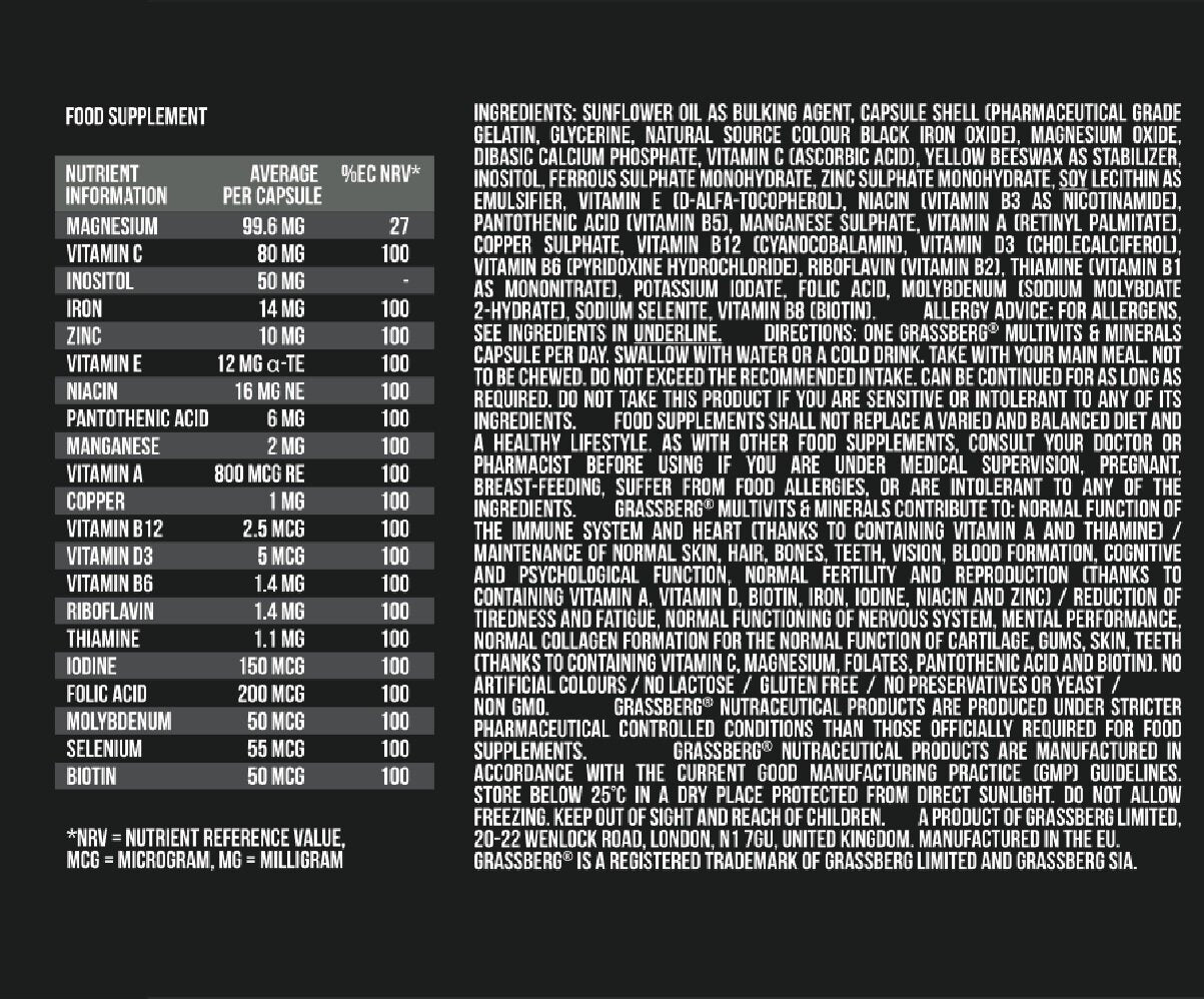 U užurbanom načinu života i za ljude na dijeti, često je težak zadatak dobiti potrebne vitamine i minerale iz raznih namirnica. Grassberg Multivits & Minerals vam omogućuje da to učinite bez dodavanja nepotrebnih kalorija u prehranu, što bi moglo ugroziti vaše rezultate.