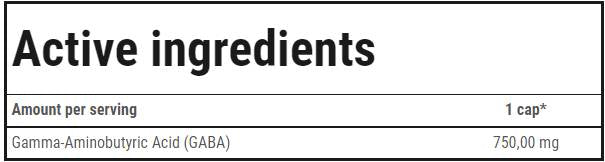 SASTAV: gama-aminomaslačna kiselina (GABA) (85,2%); ovojnica kapsule (želatina; boja – titanijev dioksid); sredstvo protiv zgrudnjavanja – magnezijeve soli masnih kiselina.