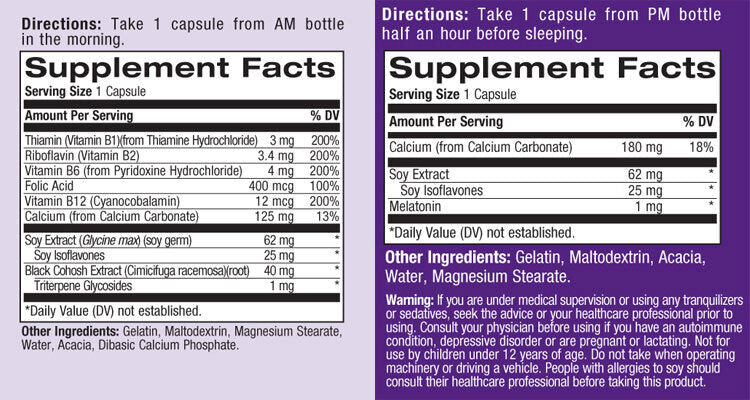 Osmišljen kako bi pomogao ublažiti simptome povezane s menopauzom, Natrol Complete Balance® Menopause AM/PM sadrži soju, kalcij, crni kohoš i vitamine. Sa svojom posebno dizajniranom formulom može pomoći u smanjenju valova vrućine, noćnog znojenja, promjena raspoloženja i drugih simptoma menopauze.* Također može pomoći u ravnoteži hormona kod žena u predmenopauzi*.