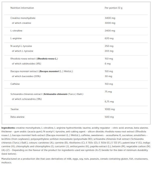 Sastojci: kreatin monohidrat, L-citrulin, L-arginin hidroklorid, taurin, regulator kiselosti - limunska kiselina; arome, beta-alanin, zgušnjivač - guma arabika (akacijeva guma); N-acetil-L-tirozin, sredstvo protiv zgrudnjavanja - silicijev dioksid; ekstrakt korijena rhodiola rosea (Rhodiola rosea L.), ekstrakt biljke bacopa monnieri (Bacopa monnieri (L.) Wettst.), kofein, sladila - acesulfam K, sukraloza; emulgatori - lecitini (od soje), polioksietilen sorbitan monooleat (polisorbat 80);sanekstrakt ploda dra chinensis (Schisandra chinensis (Turcz.) Baill.), boje: karoteni, karmin, riboflavini, E 150c, E 150d, E 133, patent plava V, indigo karmin, klorofili i klorofilini, kurkumin, antocijanini, ekstrakt crvene paprike, betanin, biljni ugljik