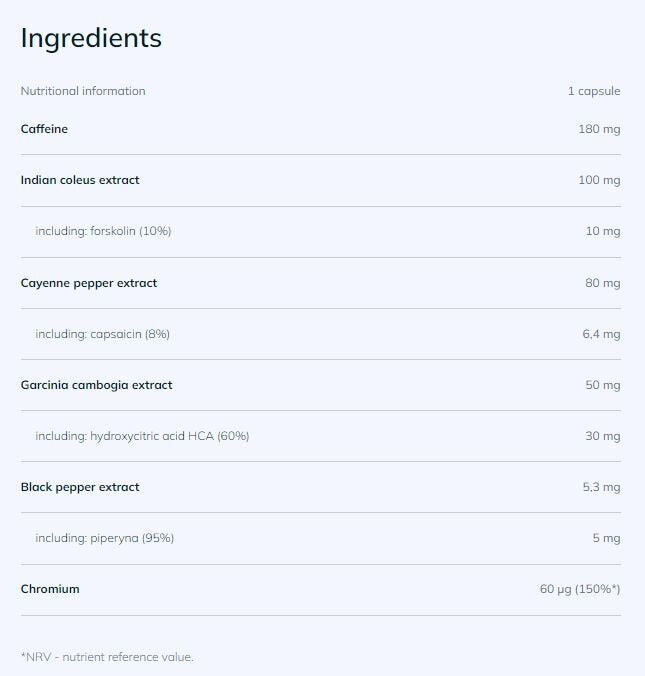 Sastojci: bezvodni kofein, punilo – mikrokristalna celuloza; Ekstrakt indijskog koleusa (Coleus forskohlii), ekstrakt čili papričice (Capsicum annuum L.), ekstrakt kore ploda garcinije kambodžanske, tvari protiv zgrudnjavanja – magnezijeve soli masnih kiselina, silicijev dioksid; Bioperine® ekstrakt crnog papra (Piper nigrum L.), kromov pikolinat, kapsula (sastojci ovojnice: želatina, boja – E 171)