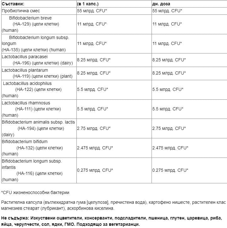Critical Care Probiotic je zaštićena mješavina 9 želudačno stabilnih sojeva sa snažnom koncentracijom od 55 milijardi aktivnih stanica koje djeluju u sinergiji za maksimalnu aktivnost i učinkovitost. Sojevi su bifidobakterije i laktobacili za ciljanu potporu tankog i debelog crijeva. Kompleks obnavlja korisne bakterije izgubljene korištenjem antibiotika, stresom, prehranom, putovanjima i gastrointestinalnim poremećajima. Ova formula nudi značajnu zaštitu od bakterijske infekcije, prekomjernog rasta gljivica i probavnih smetnji. Patentirana sinergistička mješavina sadrži: Bifidobacterium breve, Bifidobacterium longum, Lactobacillus paracasei, Lactobacillus plantarum, Lactobacillus acidophilus, Lactobacillus rhamnosus, Bifidobacterium lactis, Bifidobacterium bifidum, Bifidobacterium infantis.