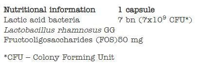 Sastojci: maltodekstrin, fruktooligosaharidi, Lactobacillus rhamnosus GG (ATCC 53103), komponente ovojnice kapsule (sredstvo za glaziranje - hidroksipropil metilceluloza, stabilizator - gelan guma, boja - titanijev dioksid).