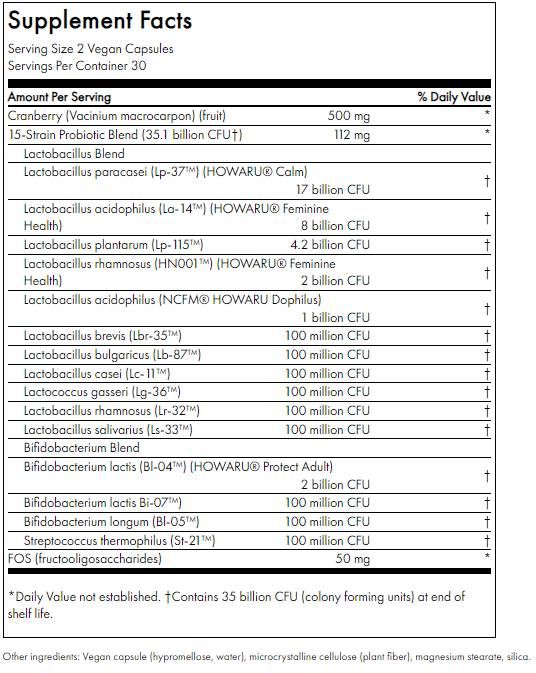 Svaka doza od 2 vege kapsule sadrži brusnicu i prebiotik FOS u kombinaciji s 35 milijardi korisnih bakterija