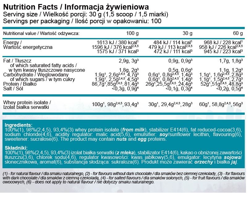 Sastojci: 98% izolat proteina sirutke (od mlijeka), emulgator: sojin/suncokretov lecitin, sladilo: sukraloza