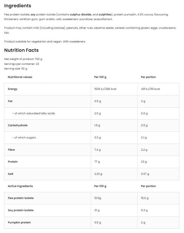 Veganska mješavina proteina sadrži sinergističku kombinaciju proteina graška, soje i bundeve, koja pruža kompletan profil aminokiselina potreban za optimalno funkcioniranje tijela. Ova formula je posebno dizajnirana kako bi osigurala potrebne hranjive tvari za aktivan način života, a istovremeno je potpuno biljnog podrijetla i lako probavljiva.