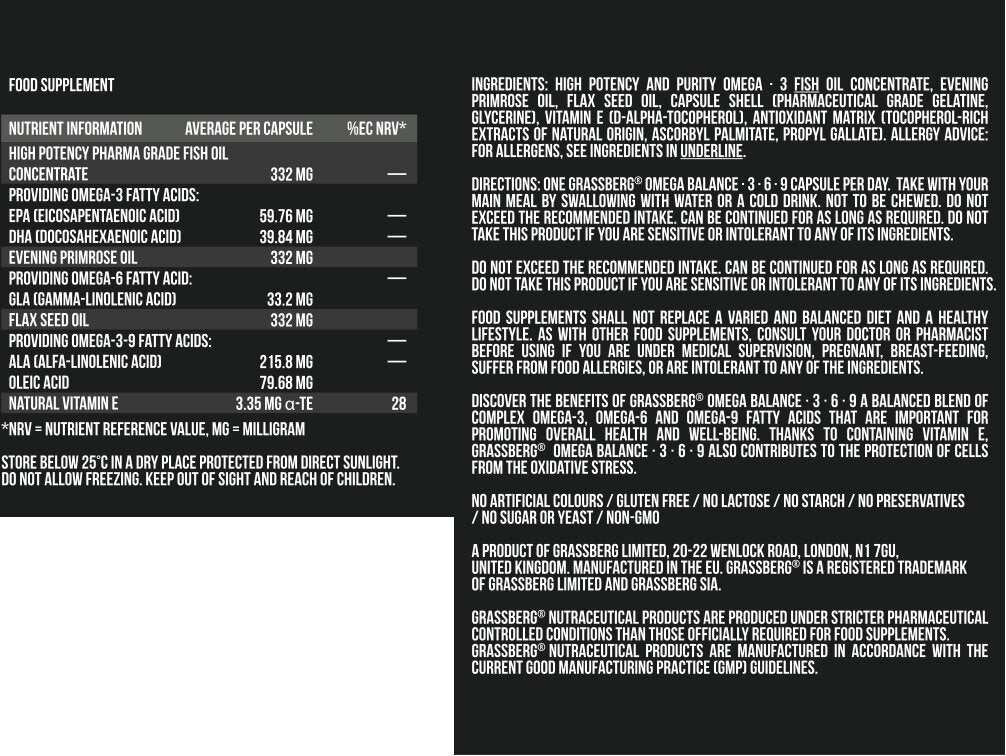 Grassberg Omega 3-6-9 Balance 1000mg je kombinacija esencijalnih masnih kiselina za naše zdravlje. Svaka od tri masne kiseline ima koristi za naše zdravlje, ali važno je da omega 3, 6 i 9 budu u pravoj ravnoteži. Sadrži dobro uravnoteženu dozu tri korisne nezasićene masne kiseline i vitamina E.