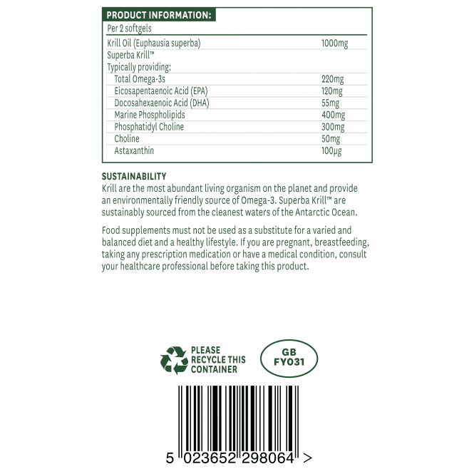 Natures Aid Ulje antarktičkog krila Superba ekstrahiran je iz zooplanktona iz najčišćih voda Antarktičkog oceana i certificiran je od strane British Council for Sustainable Sea Basin Development. Meke tablete bez okusa, mirisa i lake za gutanje. Ulje krila izvrstan je izvor omega 3 masnih kiselina, uključujući EPA i DHA. Karakterizira ga visoka koncentracija fosfolipida, što ga čini lakšim za korištenje u tijelu, manje od ribljeg ulja, budući da su općenito omega-3 masne kiseline u ribljem ulju pohranjene u obliku triglicerida. Ulje krila sadrži fosfatidilkolin i astaksantin. Fosfatidilkolin je glavni fosfolipid u ljudskom tijelu, građevni blok staničnih membrana. Uključen je u brojne procese u tijelu, poput transporta masti iz jetre u krvotok. Podržava stanje jetre i njezine funkcije. Astaksantin je prirodni karotenoid koji zbog svoje jedinstvene strukture pruža širok raspon antioksidativnih prednosti. Budući da astaksantin može prijeći krvno-moždanu i krvno-retinalnu barijeru, može pružiti snažnu antioksidacijsku zaštitu izravno očima, mozgu i živčanom sustavu. Protuupalna svojstva omega-3 masnih kiselina štite od kardiovaskularnih bolesti, raka i dijabetesa tipa 2. Pospješuju cirkulaciju krvi u tijelu, snižavaju loš kolesterol i krvni tlak te podržavaju zdravlje zglobova.