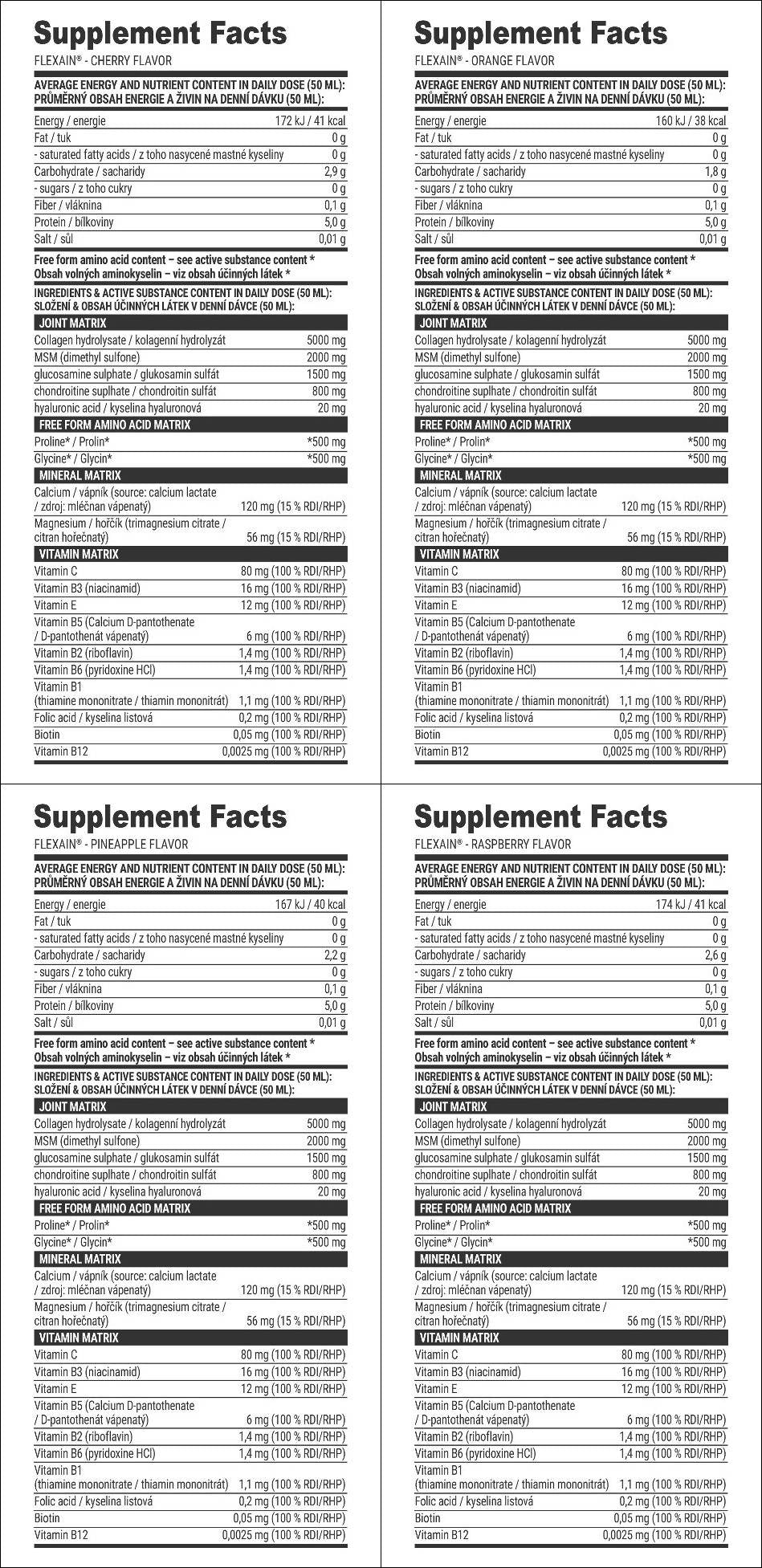 FLEXAIN sadrži kombinaciju svih tvari koje su bitne za dobru funkciju zglobova: kolagen hidrolizat (kolageni peptidi), MSM, hondroitin sulfat, glukozamin sulfat, hijaluronsku kiselinu, minerale kalcij i magnezij te slobodne aminokiseline prolin i glicin. kompleks vitamina, od kojih posebno vitamin C doprinosi normalnom stvaranju kolagena za normalnu funkciju krvnih žila, hrskavice i kostiju.