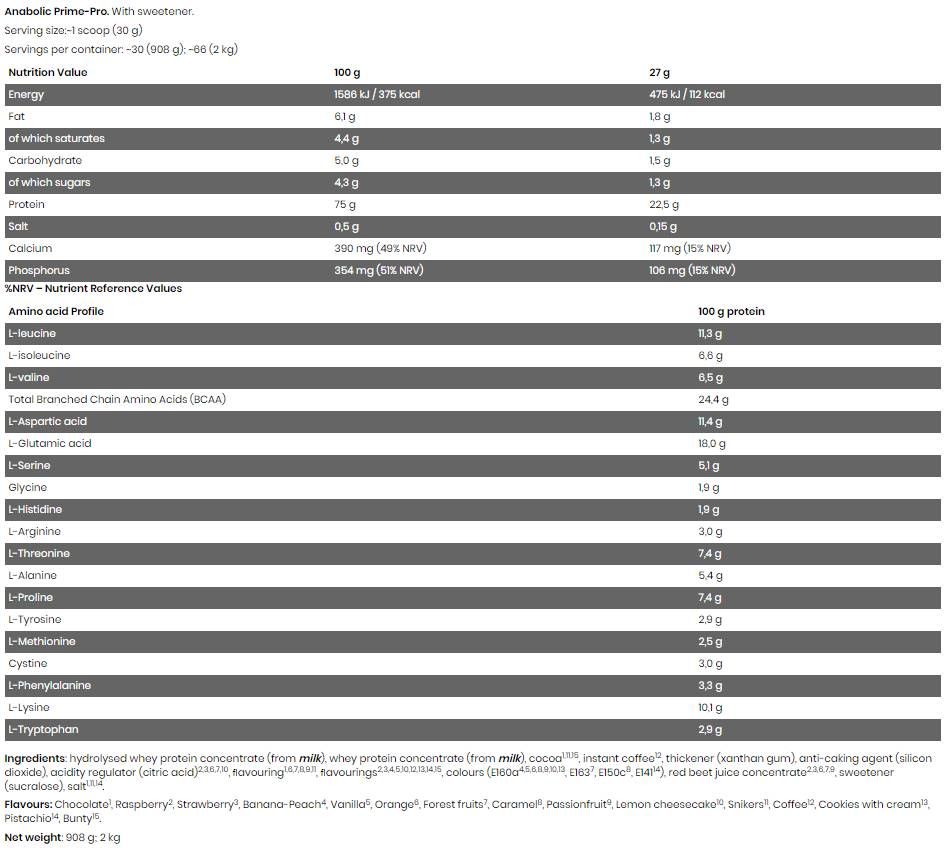 Anabolic Prime Pro je 100% protein sirutke, koji se uglavnom sastoji od hidrolizata proteina sirutke. Anabolic Prime Pro je najkvalitetniji protein sirutke koji osigurava da vaši mišići dobiju najbolju moguću prehranu i oporavak, i to odmah nakon uzimanja!