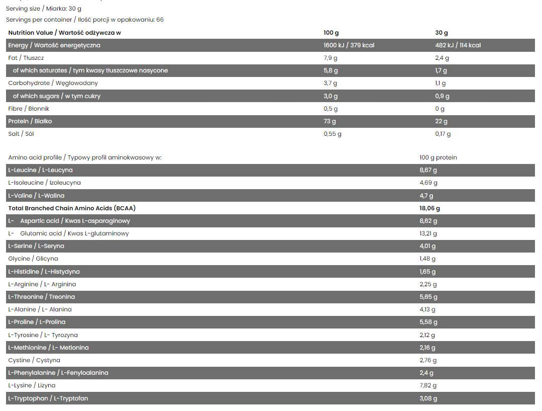 Preporučeni unos: Pomiješajte 1 mjericu (30 grama) s vodom, sokom ili mlijekom. Uzmite ujutro i nakon treninga. Može se uzimati tijekom treninga.
