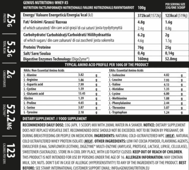 WHEY-X5 je precizno formuliran kako bi vam pomogao u izgradnji i održavanju čiste mišićne mase. To se postiže brzom apsorpcijom izolata i koncentrata proteina sirutke. Koristimo najbolje moguće aminokiseline s visokom dozom BCAA (5,3 g po dozi), koje se prirodno nalaze u proteinu sirutke. Genius Nutrition koristi najkvalitetniji 100% protein sirutke, dobiven prirodnom filtracijom, koji ima visoka svojstva apsorpcije i probave, u kombinaciji s DIGEZYME®-om (probavni enzimi). WHEY-X5 ima vrhunska nutritivna svojstva, koja su važna za sve koji žele izgraditi mišićnu masu bez skladištenja masti, a istovremeno proizvod ima nevjerojatan okus.