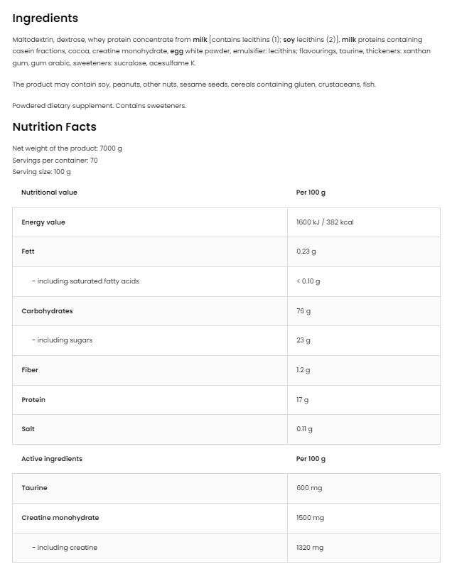 Anabolički gainer | Gainer za masu s kreatinom i taurinom 7000 grama