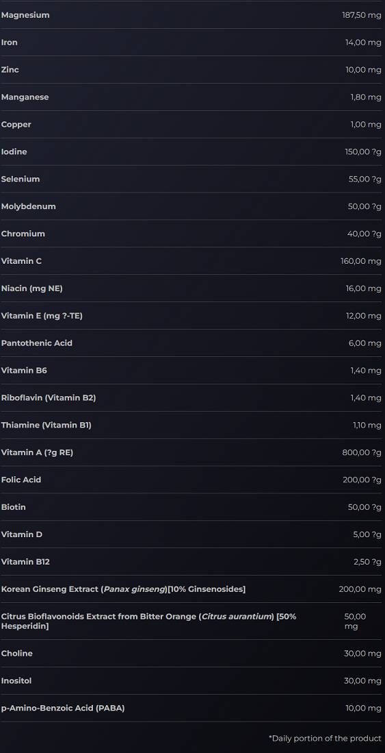 SASTAV: Esencijalni mineralni kompleks [magnezijev oksid; magnezijev karbonat; željezni fumarat; maltodekstrini; cinkov sulfat; manganov sulfat; bakreni sulfat; kalijev jodid; krom klorid; natrijev molibdat; natrijev selenat]; Pospješivači metabolizma [ekstrakt korejskog ginsenga (Panax ginseng) [10% ginsenozida]; Bioflavonoidni ekstrakt citrusa iz gorke naranče (Citrus aurantium) [50% hesperidin]; holin bitartrat; Inozitol; p-aminobenzojeva kiselina (PABA)]; Formula vitamina [vit. C (L-askorbinska kiselina); niacin (nikotinamid); vit. E (DL-alfa-tokoferil acetat); pantotenska kiselina (kalcij D-pantotenat); vit. B6 (piridoksin hidroklorid); riboflavin; tiamin (tiamin mononitrat); vit. A (retinil acetat); folna kiselina (pteroilmonoglutaminska kiselina); biotin (D-biotin); vit. D (kolekalciferol); vit. B12 (cijanokobalamin)]; ovojnica kapsule (želatina; boje – titanijev dioksid, željezni oksidi i hidroksidi, patent plava V); sredstvo protiv zgrudnjavanja – magnezijeve soli masnih kiselina.