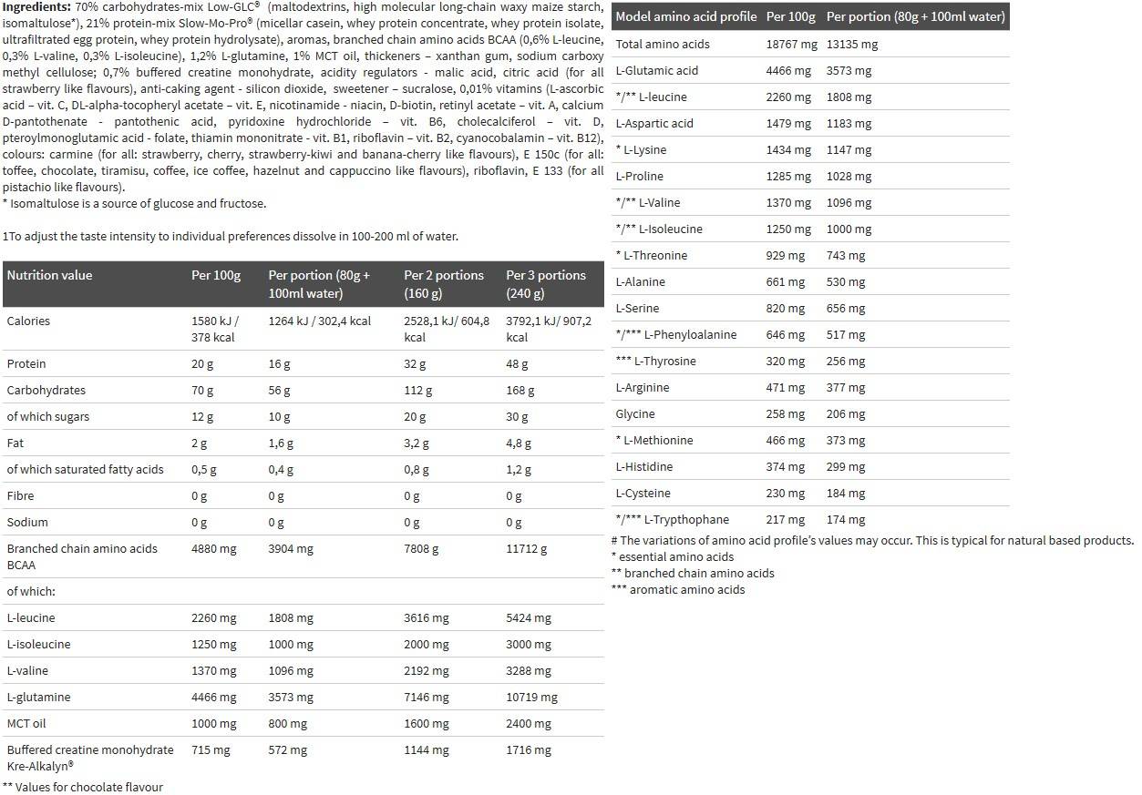 Ugljikohidrati s niskim GLC™ udjelom pružaju izvor energije već 30 minuta nakon unosa i traju gotovo 4 sata. Uzimanje nakon treninga osigurava nadoknadu hranjivih tvari za optimizaciju procesa rekonstrukcije. Dodatak MCT ulja i puferiranog kreatin monohidrata ( Kre-Alkalyn® ) usmjeren je na poboljšanje i minimiziranje faze regeneracije kako bi rast nakon treninga proizašao bez ikakvih prepreka.