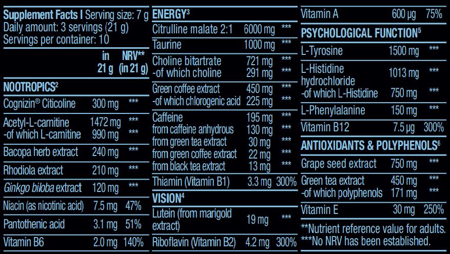 Formula sadrži L-citrulin, L-tirozin, acetil-L-karnitin, taurin i mnoge druge, koji su pažljivo odabrani kako bi se osigurali optimalni rezultati. Za puni sastav proizvoda pogledajte drugu sliku.