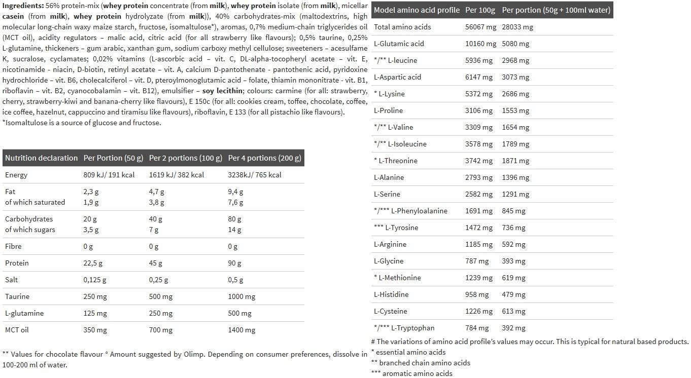 Kombinacija proteina (koncentrat proteina sirutke, micelarni kazein, izolat proteina sirutke i hidrolizat proteina sirutke) i ugljikohidrata u omjeru 50:50.