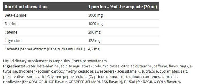 Preporučena uporaba: 1 porcija dnevno = ½ ampule (30 ml), oko 30 minuta prije treninga. Protresti prije upotrebe. Jedna ampula sadrži 2 porcije. Nakon otvaranja čuvati u hladnjaku i konzumirati unutar 48 sati.