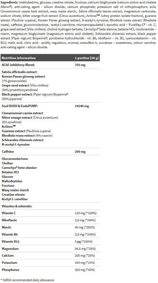 Upute za uporabu: Uzmite 1 dozu = 20 g (1 ¼ mjerice) otopljenu u 200 ml vode 30-45 minuta prije treninga snage.